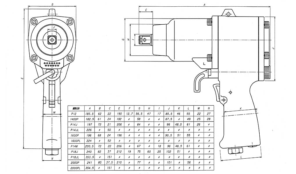 | Model | Tip tool mounting size | Adjustment dial steps | Capacity ordinary bolt O/D(mm) | Torque range(N・m) | No load speed(rpm) | Air consumption(m3/min) | Air pressure(MPa) | Air hose inner O/D(mm) | Overall Length(mm) | Weight(g) | Code No. |
