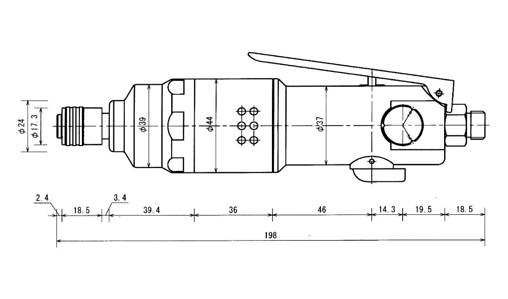 | Model | Tip tool mounting size | Adjustment dial steps | Capacity standard screw O/D(mm) | Capacity self-tapping screw O/D(mm) | Capacity wood screw O/D(mm) | Capacity bolt O/D(mm) | No load speed(rpm) | Air consumption(m3/min) | Air pressure(MPa) | Air hose inner O/D(mm) | Overall Length(mm) | Weight(g) | Code No. |