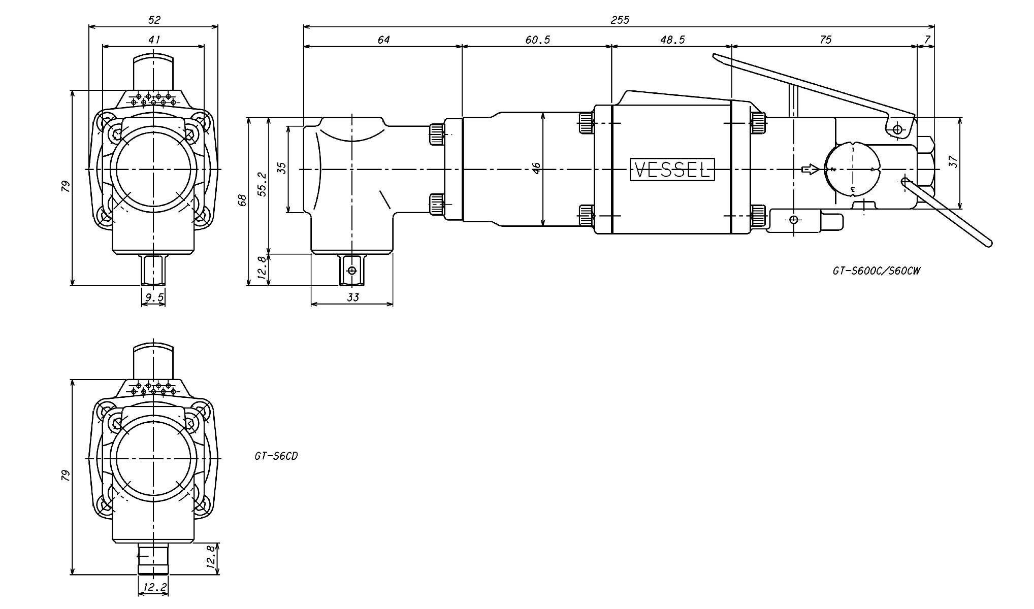 Model Tip tool mounting size Adjustment dial steps Capacity ordinary bolt O/D(mm) Torque range(N・m) No load speed(rpm) Air consumption(m3/min) Air pressure(MPa) Air hose inner O/D(mm) Overall Length(mm) Weight(g) Code No.